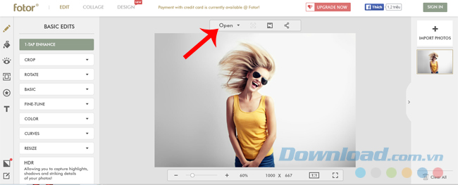 Bước 2: Giao diện của Fotor phiên bản web hiện ra. Ấn tượng ban đầu của tất cả người dùng, đó là sự gọn gàng, đơn giản và rất thân thiện. Để bắt đầu chỉnh sửa ảnh, các bạn chọn vào Open.