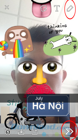 Một điểm ấn tượng nữa của Snapchat là chỉ cần vuốt ngang màn hình về hai bên trái, phải để thay đổi bộ lọc ảnh, tạo ra các hiệu ứng ảnh khác nhau. Biểu tượng mũi tên phía dưới (bên phải) màn hình cung cấp các nhãn dán đặc biệt mà chỉ Snapchat mới có.