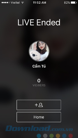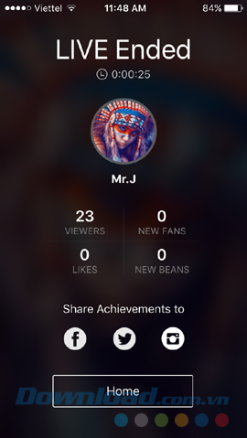 Nếu muốn kết thúc việc stream, chỉ cần nhấp vào biểu tượng dấu nhân ở góc trên, bên phải màn hình. Đồng thời, tại màn hình kết thúc cũng sẽ hiển thị thời gian của video, số lượng người xem, fan mới, có ai like không?...
