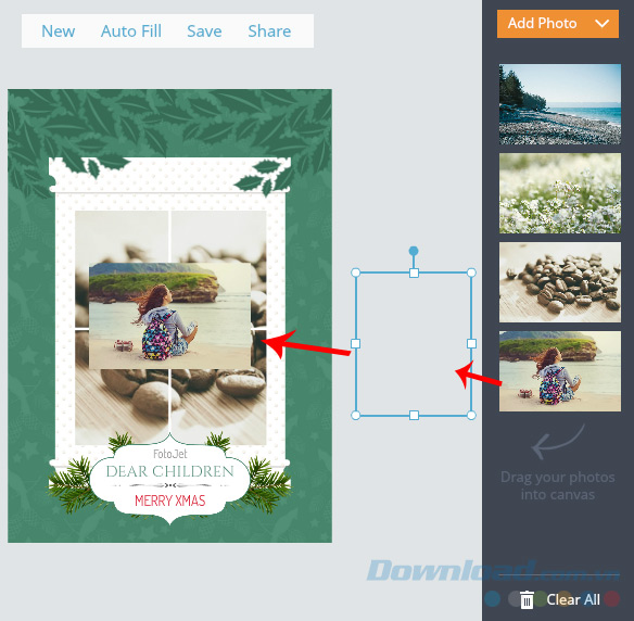 Nếu muốn, có thể click vào Add Photo để thêm ảnh của chính mình từ trong máy vào FotoJet. Sau đó cũng giữ và kéo vào khung như trên.