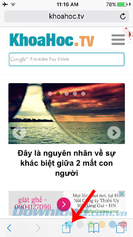 Bước 1: Từ giao diện chính của Safari, các bạn truy cập vào địa chỉ trang bất kỳ muốn xem tin tức. Sau đó chọn vào biểu tượng ô vuông có mũi tên hướng lên và chọn tiếp vào mục Add to Reading List (hình cái kính).