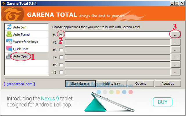Nếu muốn thiết lập tự động chạy các ứng dụng khác để tiết kiệm thời gian thì trên giao diện chính của chương trình nhấn vào thẻ Auto Open, sau đó đánh dấu tích vào 1 slot, rồi ấn nút ba chấm để chọn file của chương trình cần chạy. Sau đó mỗi lần mở Garena Total lên các chương trình này sẽ tự động chạy.