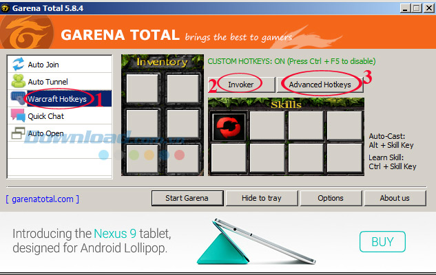 Trên giao diện chính của chương trình nhấn vào thẻ Warcraft Hotkeys, sử dụng tổ hợp phím Ctrl + F5 để kích hoạt hoặc vô hiệu hoá chức năng này. Nhấn vào Invoker để tạo phím tắt cho cho Invoker, còn nhấn vào Advanced Hotkeys để thiết lập phím tắt nâng cao.