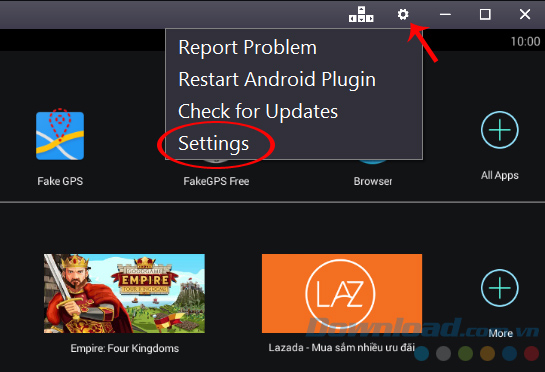 Bước 1: Cũng từ giao diện chính của giả lập, các bạn click vào biểu tượng tùy chọn ở góc trên, bên phải (hình bánh răng cưa) rồi vào Settings.