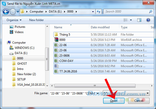 Bước 5: Cửa sổ Windows xuất hiện, tìm tới vị trí lưu dữ liệu cần gửi đi, chọn vào đó rồi Open.