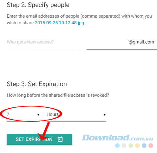 Bước 5: Lúc này bạn sẽ được vào chi tiết phần thiết lập, bao gồm việc đặt quyền cho những người trong nhóm, được bạn chia sẻ dữ liệu này (những ai được xem, ai được phép chỉnh sửa). Đồng thời trong mục Set Expiration, chọn vào hai biểu tượng mũi tên bên dưới để xác định thời gian cho phép dữ liệu của mình được tồn tại. Thời gian dao động khá lớn, từ một vài tiếng cho tới cả vài tháng hoặc năm.