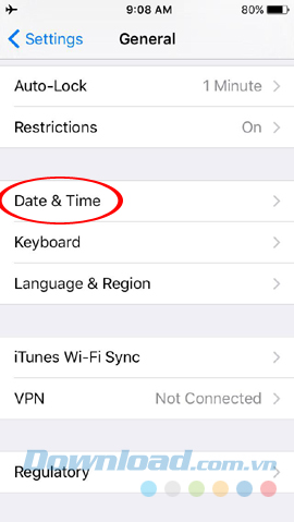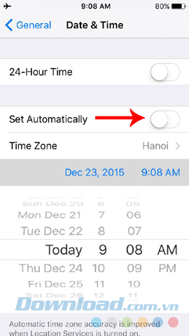 Vào mục Settings / General, chọn vào Date & Time, sau đó chỉnh cho thời gian lùi lại khoảng 1,2 năm (càng gần thời điểm phát hành bản Zalo càng tốt) và bỏ chế độ Set Automatically đi.