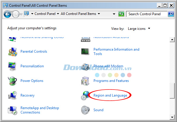 Bước 2: Cửa sổ Control Panel\All Control Panel Items xuất hiện, kéo xuống phía dưới tìm tới dòng Region and Language và click vào đó.