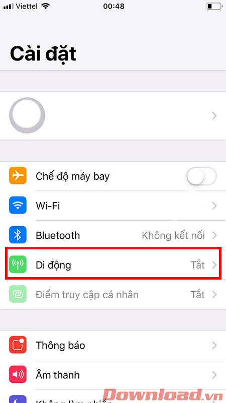 Cách đầu tiên đó là các bạn cần kiểm tra dữ liệu di động đã bật chưa. Trong Setting chọn nút Di động.