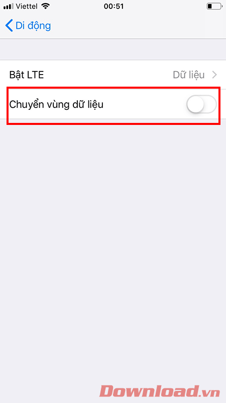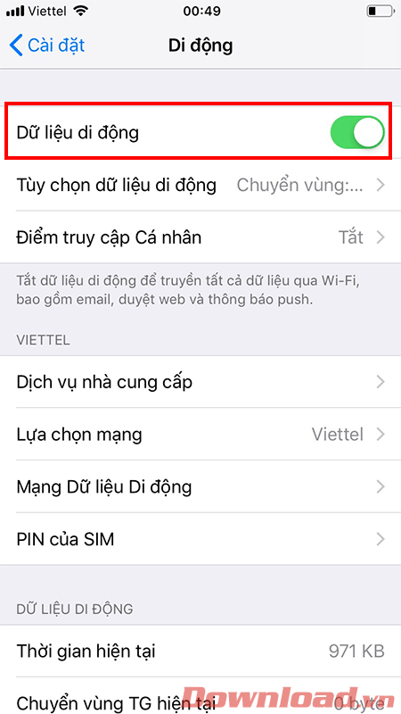 Gạt nút Dữ liệu di động sang vị trí On. Nếu đang ở On, hãy gạt sang Off sau đó gạt On 1 lần nữa để mở lại.