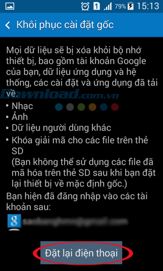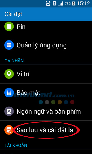 Lưu ý: Khôi phục cài đặt mặc định sẽ biến thiết bị của bạn quay lại trạng thái như lúc mới xuất xưởng, nên trước khi khôi phục hãy sao lưu tất cả dữ liệu cần thiết như: Hình ảnh, nhạc, danh bạ điện thoại, dữ liệu ghi chú...