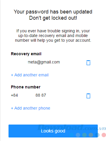 Các bạn có thể thêm địa chỉ email mới hoặc số điện thoại mới vào Recovery email và Add another phone bên dưới rồi Enter để bổ sung, hoặc chọn luôn vào Looks Good để bỏ qua.