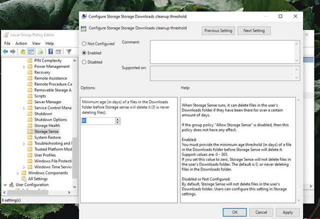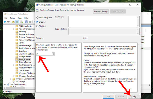 Bước 2: Cũng chọn vào Enabled như các trường hợp ở trên. Khi cửa sổ Configure Storage Sense Recycle Bin cleanup threshold xuất hiện, bạn điền thời gian muốn Storage Sense thực hiện việc quét dọn của mình, sau đó Apply / OK.