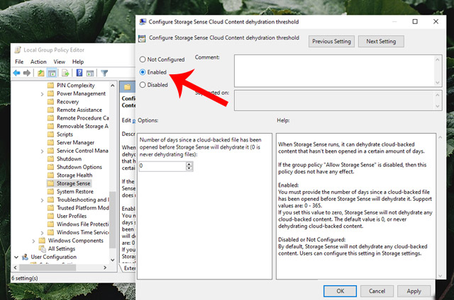 Bước 2: Tại cửa sổ Configure Storage Sense Cloud Content dehydration threshold hiện ra, nhấn chọn Enabled.