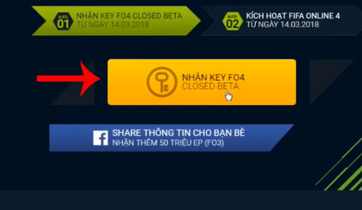 Bước 4: Tiếp tục quay ra phần nhận key, bấm vào Nhận Key FO4. Bạn có thể Share để nhận thêm 50 triệu EP cho FIFA Online 3