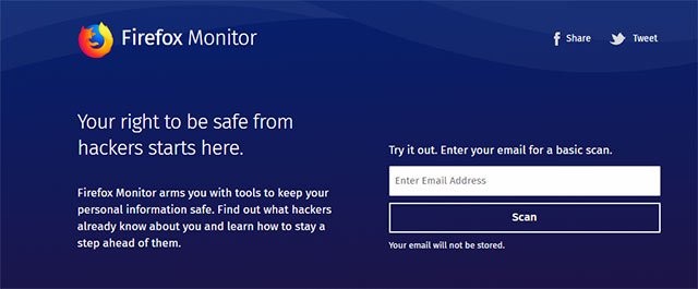 Hacker luôn là mối đe dọa vô cùng nguy hiểm với những người thường xuyên làm việc trực tuyến và có dữ liệu quan trọng. Chúng thường xuyên khai thác các lỗ hổng về bảo mật và thói quen của người dùng với mục đích nắm quyền kiểm soát. Dưới đây chúng tôi sẽ hướng dẫn các bạn cách kiểm tra tài khoản email của mình xem đã từng bị hacker đánh cắp hay chưa với công cụ Firefox Monitor được phát hành bởi Mozilla. Firefox Monitor cho phép người dùng kiểm tra xem tài khoản trực tuyến của người dùng bao gồm tài khoản email và các dịch vụ, trang web trực tuyến, vv đã từng bị hacker đánh cắp thông tin hoặc đang bị kiểm soát rất dễ dàng.