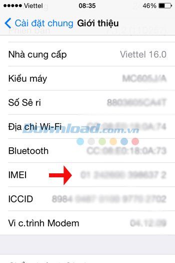Tại đây, bạn tiếp tục nhấn vào phần Giới thiệu, sẽ thấy xuất hiện thông tin giới thiệu về điện thoại iPhone bạn đang sử dụng như nhà cung cấp, kiểu máy, số sê ri... trong đó có cả số IMEI iPhone của bạn ở đó.
