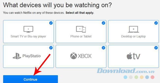 Bước 6: Chọn thiết bị mà bạn sẽ sử dụng để xem phim trên Netflix rồi Continue.