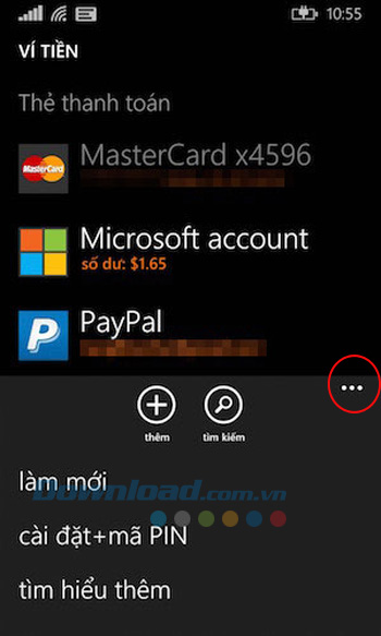 Bước 4: Sau khi hoàn thành các bước trên, truy cập vào phần Cài đặt ứng dụng, kéo xuống dưới cùng chọn Ví tiền. Cửa sổ Ví tiền xuất hiện, nhấn vào biểu tượng dấu ... ở góc gần phía dưới bên phải màn hình (như hình dưới) và chọn Làm mới để tạo thêm hình thức thanh toán.