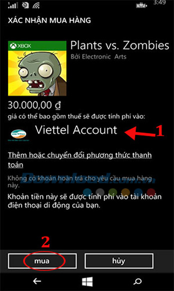 Bước 5: Lúc này bạn sẽ thấy xuất hiện tài khoản di động trong ví tiền có tên là Viettel Account. Bây giờ bạn có thể vào Windows Phone Store và chọn một ứng dụng tính phí bất kỳ nào để mua bằng tài khoản di động rồi, khi bạn nhấn vào mua ứng dụng nào đó sẽ thấy xuất hiện thêm tùy chọn thanh toán bằng Viettel Account. Rồi nhấn vào Mua để mua ứng dụng đó.