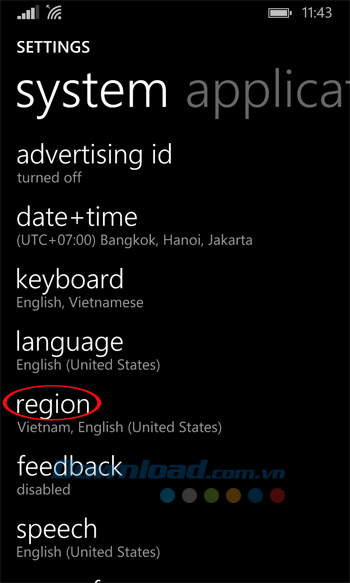 Bước 1: Đầu tiên truy cập vào biểu tượng hình bánh răng (Settings), chọn Region để chọn vùng.