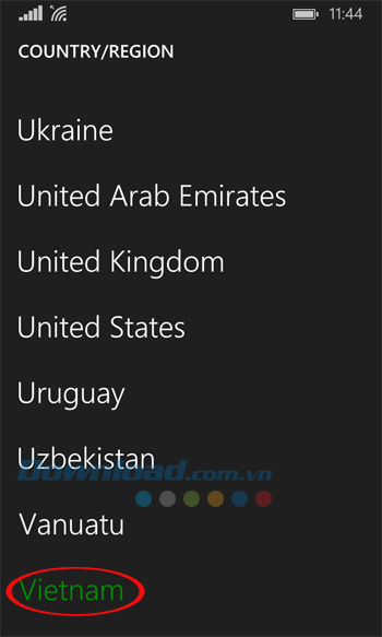Sau khi nhấn vào Country/Region sẽ xuất hiện danh sách quốc gia cho bạn lựa chọn, ở đây chúng ta hãy chọn Vietnam.