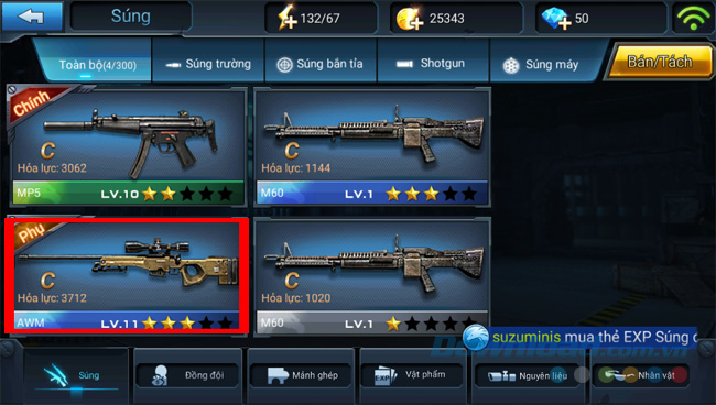 Bước 2: Danh sách toàn bộ súng hiện ra, các bạn chọn vũ khí cần nâng cấp bằng cách chạm hoặc click chuột trái vào đó. Nếu không thấy vũ khí mình cần (vì có nhiều quá), có thể chọn vào chi tiết từng danh mục súng bên trên để kiểm tra.