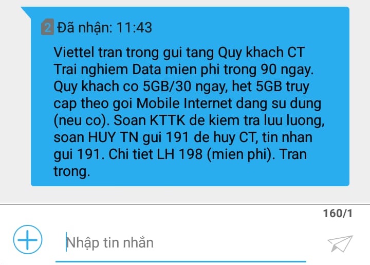 Theo đó thì Viettel sẽ gửi tặng mỗi thuê bao ưu đãi miễn phí sử dụng Mobile Internet trong 90 ngày (hệ thống cộng 5GB data sử dụng trong 30 ngày và KH có thể sử dụng được trên các hạ tầng data 2G/3G/4G). Hết 5GB truy cập theo chính sách gói data chính (nếu có). Sau 90 ngày (3 chu kỳ), hệ thống không gia hạn gói data và tự hủy gói trải nghiệm. Vào ngày thứ 90, hệ thống nhắn tin thông báo hết thời gian trải nghiệm và mời khách hàng để đăng ký gói data phù hợp trên hệ thống *098#.