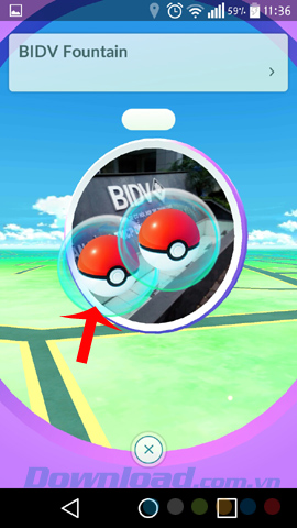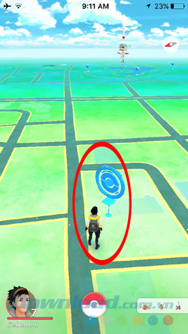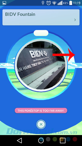 Bước 1: Từ giao diện chính của game, các bạn di chuyển tới gần một điểm Pokestop, chạm vào biểu tượng Pokestop đó. Sau khi hiện lên ảnh đại diện của Pokestop này, các bạn vuốt vào vòng tròn (vuốt ngang theo hướng từ trái sang phải hoặc ngược lại) để xoay nó.