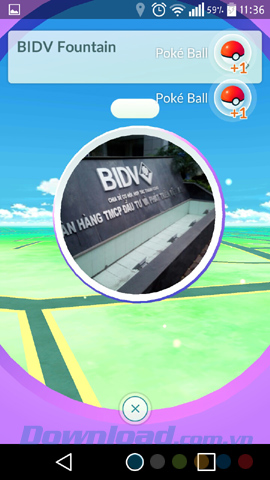 Bước 3: Pokestop đã nhận thưởng sẽ có màu tím để phân biệt với các Pokestop khác. Chúng ta có thể di chuyển hoặc ở lại và chờ khoảng 15 phút, để Pokestop này "nạp" lại quà và nhận lần tiếp theo.