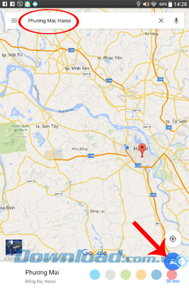 Bước 1: Truy cập vào ứng dụng Google Maps này trên điện thoại của mình. Nhập từ khóa là tên của khu vực, địa điểm muốn đến (đường, phố...) vào khung trống bên trên để Google Maps tự xác định. Sau khi địa điểm được đánh dấu, các bạn có thể thấy bên dưới chính là khoảng cách và thời gian cần để di chuyển từ vị trí hiện tại tới điểm đó.