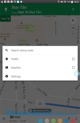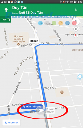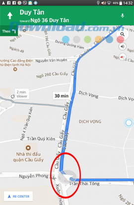 Có thể chọn vào Re-Center để quay trở lại vị trí ban đầu hoặc vuốt từ dưới lên để vào danh sách chi tiết các địa điểm sẽ rẽ và khoảng cách. Cũng có thể chọn vào biểu tượng dấu ba chấm bên cạnh đó để vào thiết lập thêm các tùy chọn khác.