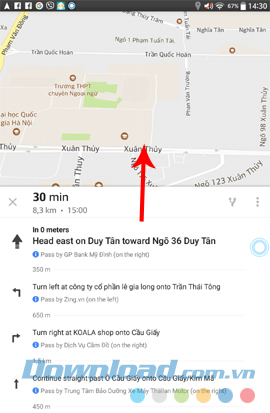 Bước 2: Cung đường di chuyển được Google Maps đưa ra sẽ có màu xanh. Đồng thời phía trên sẽ chỉ địa điểm hiện tại, bên dưới là thông báo về hướng đi, lối rẽ tiếp theo.