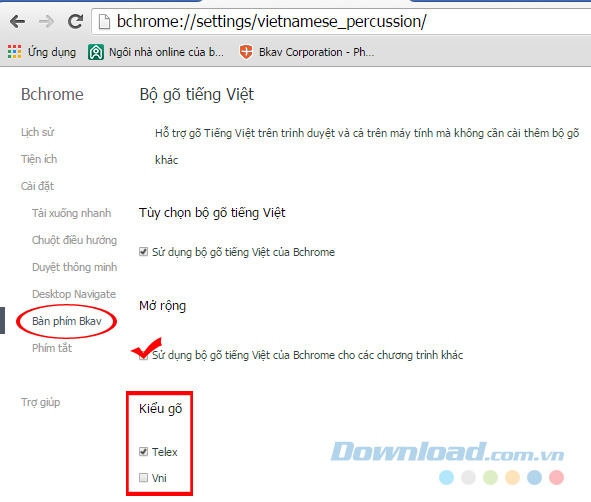 Bước 4: Thực hiện tương tự như khi thiết lập để gõ tiếng Việt trên Bchrome không cần phần mềm, click vào mục Bàn phím Bkav và tick chọn Sử dụng bộ gõ tiếng Việt của Bchrome.