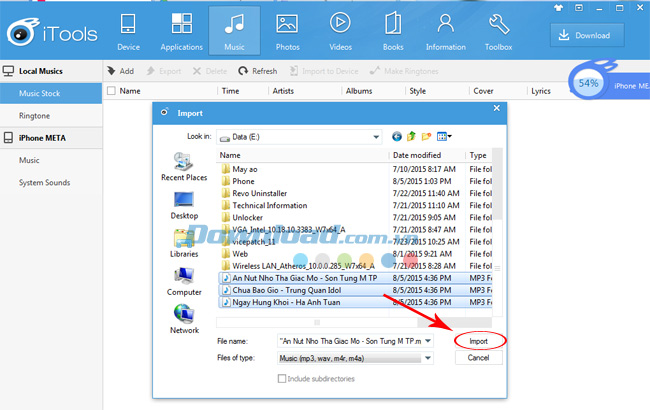Một cửa sổ nhỏ hiện ra, hãy sử dụng nó để tìm đường dẫn tới vị trí các file nhạc đang được lưu trữ trong máy tính. Chọn những bài hát bạn muốn bằng cách nhấn và giữ phím Ctrl + chuột trái vào bài hát (hoặc nếu đã lưu ra một file riêng, chỉ cần thực hiện thao tác với tổ hợp phím Ctrl + A để chọn tất cả, sau đó nhấp vào Import để đưa lên thiết bị).