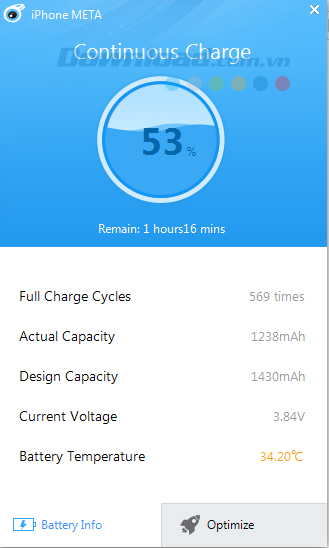 Kết nối thiết bị iOS với iTools thông qua dây cáp, các bạn sẽ thấy hiện ra giao diện tổng quan về thiết bị ấy như trên, bao gồm: tên thiết bị, phiên bản đang sử dụng, tình trạng jailbreak, nguồn gốc máy, dữ liệu trống, dữ liệu đã sử dụng...Ngoài ra, bên cạnh giao diện chính còn có một icon nhỏ, hình đầu chú thỏ với tỷ lệ phần trăm hiển thị trong đó (phần trăm pin còn lại), các bạn nhấp chuột trái vào đó, sẽ hiện ra giao diện của Continuous Charge cùng các thông tin liên quan.