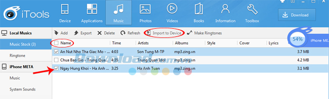 Quan sát giao diện iTools, các bạn sẽ thấy những bài hát vừa chọn đã được hiển thị lên danh sách trống. Tại đây, các bạn sẽ thực hiện thao tác tải những bài hát này vào thiết bị của mình bằng cách tick vào ô Name để chọn tất cả, hoặc tick vào từng bài hát mình muốn để chọn riêng lẻ. Cuối cùng là nhấp vào Import to Device để thực hiện công đoạn cuối cùng.