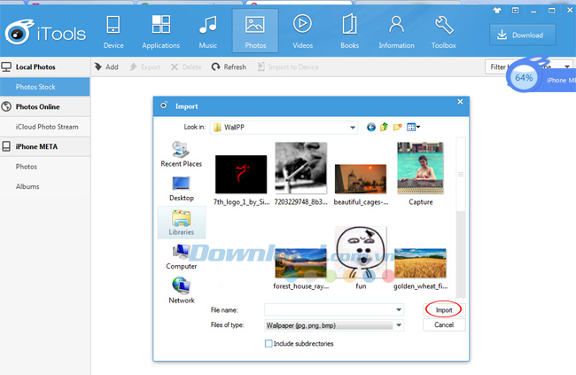 Đầu tiên cũng nhấp vào thẻ Photos trên thanh công cụ (chọn thẻ Applications nếu muốn tải game, ứng dụng, chọn Books nếu cần tải ebooks vào thiết bị), sau đó cũng nhấp chọn Add (Local Photos). Tìm đường dẫn tới vị trí để ảnh trên máy tính, chọn ảnh cần dùng rồi import.