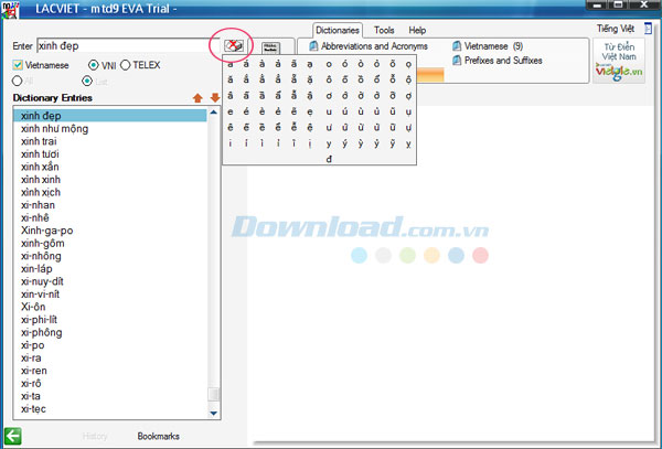 Ngoài ra, chương trình cũng hỗ trợ người dùng tra cứu từ điển tiếng Việt. Để thực hiện thao tác này, hãy nhấn chuột vào tùy chọn Vietnamese và nhập từ cần tra cứu trong ô Enter.