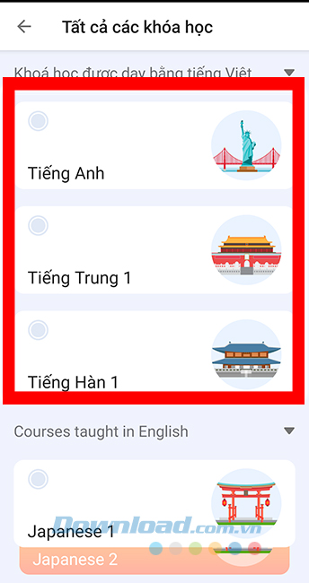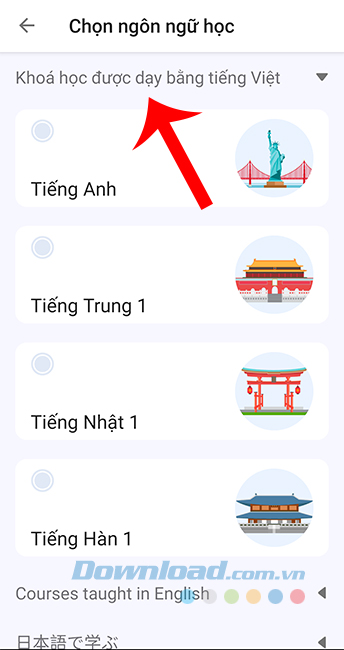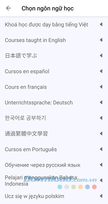 Đồng thời bên dưới, chúng ta sẽ thấy các khoá học ngoại ngữ khác nhau với rất nhiều thứ tiếng, như:
