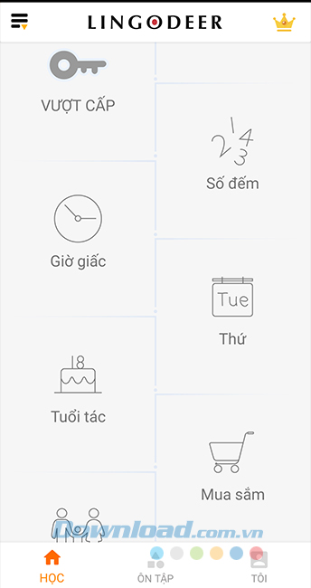 Bước 4: Chỉ cần chạm vào để chọn thể loại bài học mình muốn và bắt đầu. Một điều thú vị mà chúng ta có thể thấy rất rõ là cách dạy của LingoDeer rất độc đáo, mọi thứ được minh hoạ bằng hình ảnh rất đáng yêu, hỗ trợ âm thanh và mang lại cảm giác của một trò chơi.