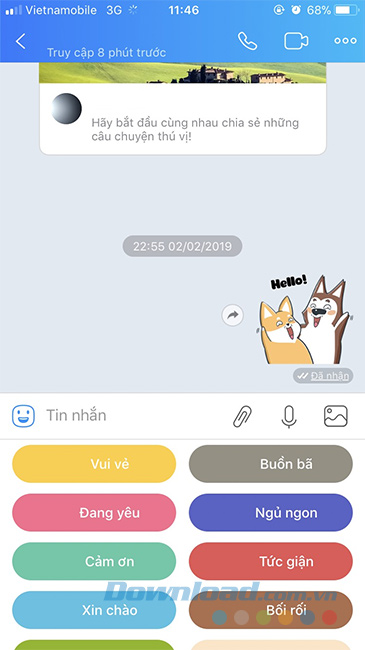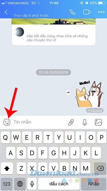 Các bạn đăng nhập vào tài khoản Zalo của mình, chọn vào một người bất kỳ muốn nói chuyện. Trong cửa sổ chat Zalo với họ, chạm vào biểu tượng Sticker như dưới đây. Tại đây, bạn sẽ thấy danh sách các bộ biểu tượng cảm xúc mà mình đang có, bạn có thể sử dụng chúng hoặc có thể chọn tiếp vào hình kính lúp để tìm các nhãn dán khác.