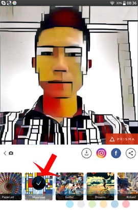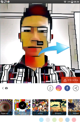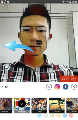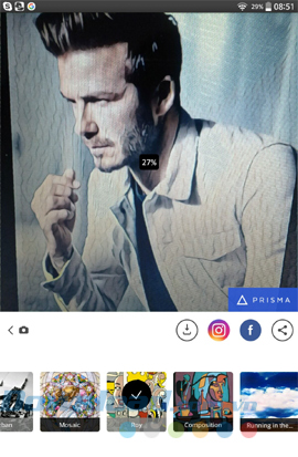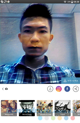 Bước 2: Chụp ảnh "đối tượng" cần thực hiện. Có thể sử dụng camera trước để "tự sướng" hoặc dùng camera sau, tùy ý. Sau khi chụp xong, ngay bên dưới khung hình sẽ xuất hiện hàng loạt các chủ đề (các bộ lọc ảnh) mà Prisma đã tích hợp sẵn. Chỉ cần chọn một bộ lọc mình thích, chạm vào đó, chờ vài giây để quá trình thay đổi được thực hiện hoàn tất. Vậy là xong!