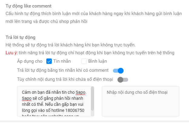 Cũng giống như trên, việc tạo câu trả lời tự động để Sapo Social trả lời nhanh cho từng câu hỏi đặc trưng của khách. Vi dụ như câu hỏi về màu sắc, về mẫu mã, về giá cả hay chất lượng sản phẩm.