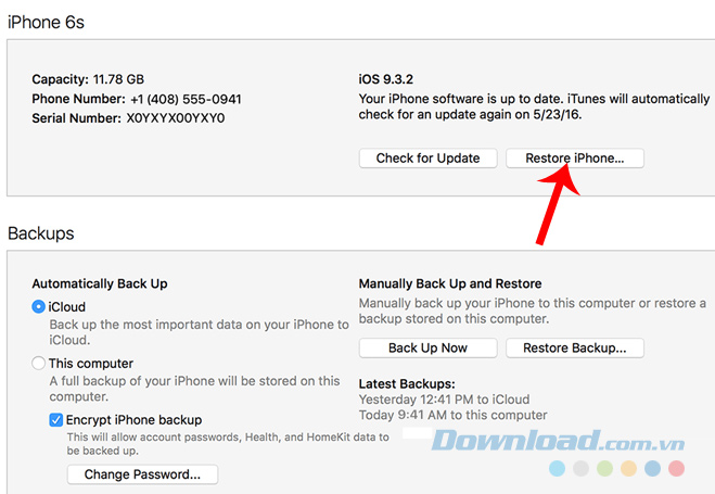 Bước 3: Bấm, giữu phím SHIFT và đồng thời click chuột trái vào mục Restore trên iTunes để bắt đầu quá trình Restore máy.