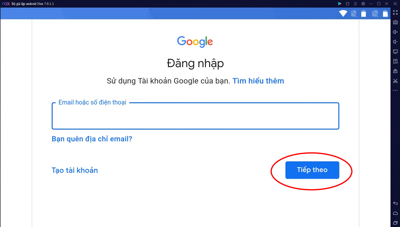 Sau khi cài đặt xong, các bạn mở Nox lên. Ở lần đầu tiên chạy, Nox sẽ yêu cầu người dùng đăng nhập vào tài khoản Google Play (CH Play). Ở màn hình hiện ra các bạn nhấn nút Đăng nhập ngay.