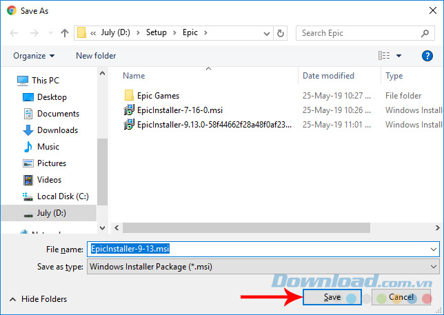 Bước 3: Chọn vị trí lưu file cài đặt Epic Games Launcher rồi Save lại.