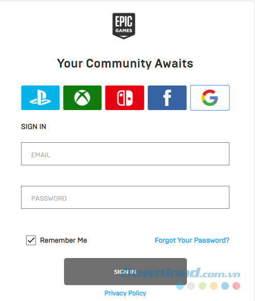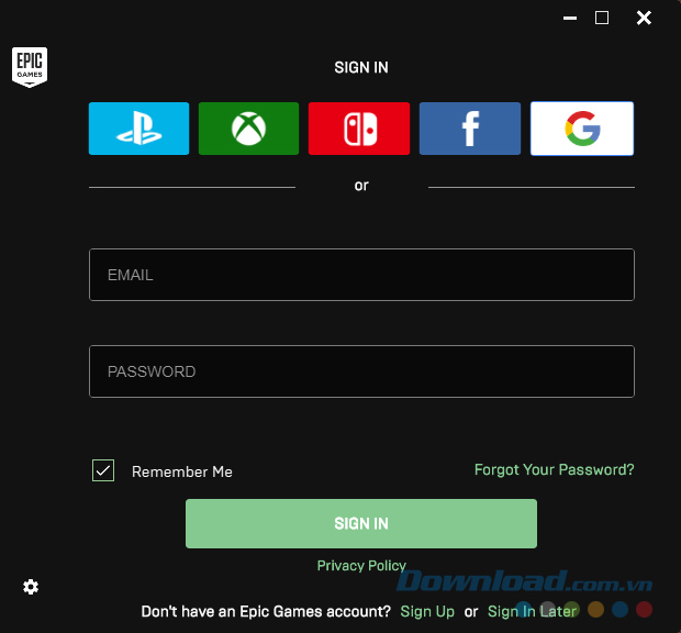 Bước 4: Đăng nhập tài khoản Epic của mình hoặc có thể sử dụng ngay một trong số các tài khoản liên kết bên dưới để vào.