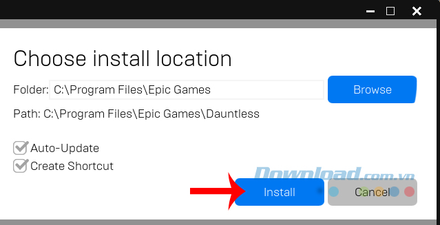 Bước 4: Chọn vị trí muốn cài đặt Dauntless trên máy tính rồi Install (hoặc có thể nhấp vào Browse rồi tìm vị trí mới).