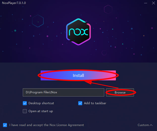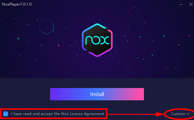 Sau khi tải xong, các bạn mở file cài đặt lên. Ở cửa sổ hiện ra, các bạn tích vào dòng I have read and accept the Nox License Agreement sau đó nhấn nút Custom ở góc phải.